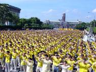 大会在上午十点正式开始,凯达格兰大道上共有近万名全台各地的法轮功学员参加,现场并展示十万人的人权征签布条,场面盛大、气势磅礴,但秩序井然,气氛祥和肃穆。