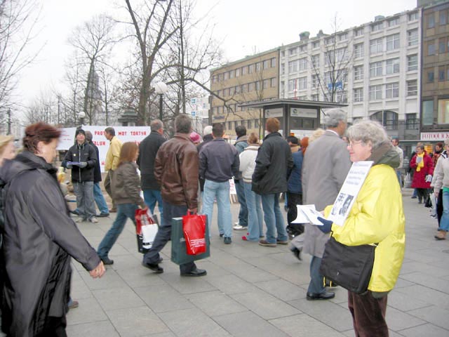 【明慧网2003年11月17日】连日来,瑞典法轮功学员利用业余时间,在中国大使馆和领事馆前和平抗议江氏集团对法轮功学员的残酷