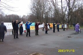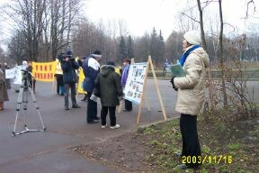 法轮大法学员,呼吁制止中国使领馆在俄罗斯散布谣言和对法轮大法的污蔑,支持全球公审江泽民。电视台记者在现场进行了录像和采访。许多过往的莫斯科人都关切地同大法学员们交谈,对中国江氏一伙对法轮功学员的人权的践踏表示愤慨。