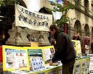 法轮功学员们希望通过这次公众展示活动,向这里的华人和过往行人介绍什么是法轮功以及法轮功在中国遭受的残酷迫害,希望大家伸出救援之手;二是告诉人们江泽民在多国被起诉的消息,原因是江泽民直接下令迫害法轮功,起诉罪名是江泽民对法轮功学员实行“群体灭绝罪”和“酷刑罪”。