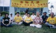 回台的前一天,想要拍照留念,没想到全部学员都到齐了,还多了一对日本裔母女,因为太阳晒得很厉害,心想他们都是新学员,不知是否愿意离开凉亭到太阳底下炼功,神奇的是当他们站到阳光底下炼功时,炙热的骄阳一下子就隐身不见了,感谢师父的慈悲苦度,关岛第一个炼功点在19天的努力下宣告成立了。