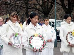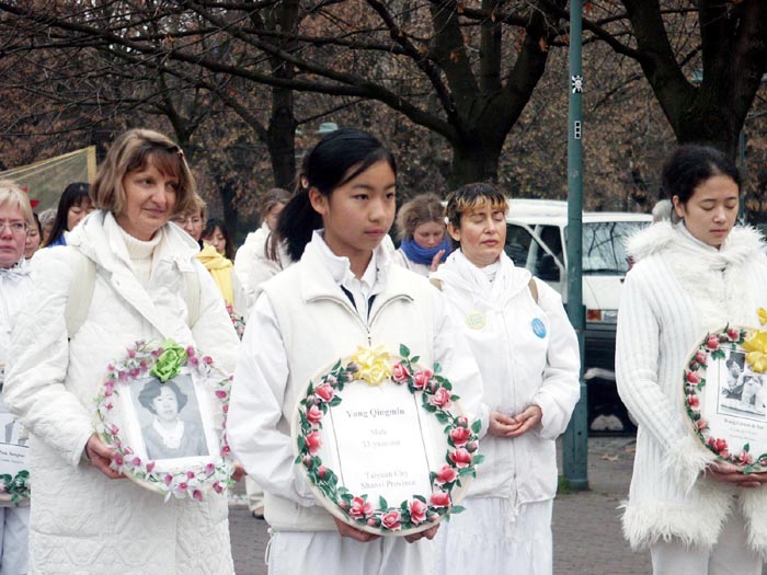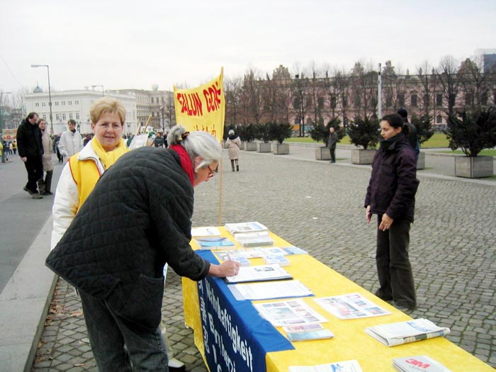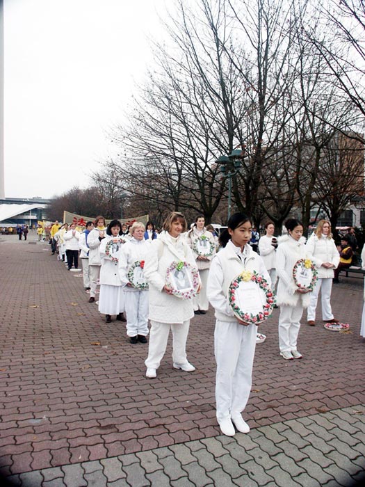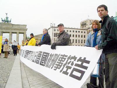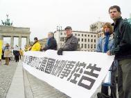 【明慧网2003年11月27日】 2003年11月22日,来自欧洲多个国家的六百多名法轮功修炼者汇聚在德国首都柏林,举行集会和游行,支持在德国以群体灭绝罪和反人类罪对中国前国家主席江泽民提起刑事诉讼。起诉人是39名生活在德国、澳大利亚、加拿大和爱尔兰的法轮功学员,他们本人或自己的亲朋好友在江泽民发动的对法轮功的镇压中直接受害。起诉状已于本周五通过律师呈交德国联邦检察院。