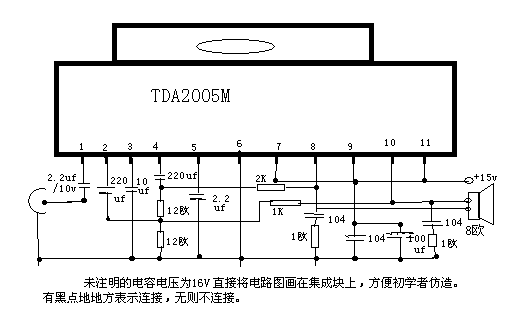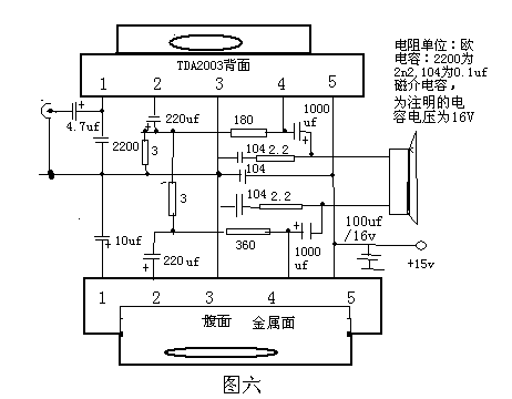 三)此处介绍两种功放,TEA2025,TDA2005M。简要介绍TDA2003,LA4440。为方便仿制,电路图直接画在集成块上,集成块的脚命名方法是:有字面朝上,脚朝向自己,从左到右为1,2,3,4……