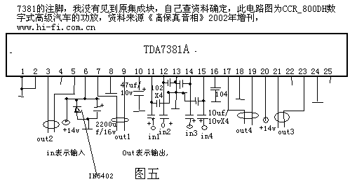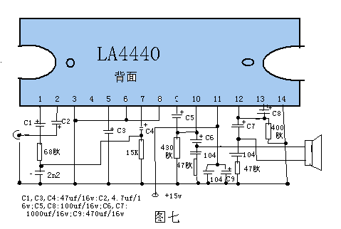附3,TDA7381A是一种高保真优选功放,电路图如图五。负载8欧时不失真输出功达到100瓦(25瓦×4ch),外围元件少,可用4个扬声器四方广播,电源用电池串联或电瓶,可用4节一号电池并联再串联成15V,如果能购买到TDA7381建议使用。TDA2003,3元一块,如图六。LA4440,10元一块,如图七。前者在10对一号干电池串联成15V时负载8欧时,输出功率达18瓦,后者则可达21瓦,此处介绍的都是BTL电路,而且性能较佳。