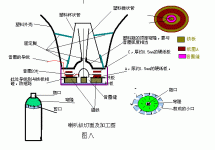 ⑷找一个厚塑料瓶(洗涤灵等),剪下瓶顶穹隆部,(如图八所示),剪口的地方剪几条缝(缝的长度等于纸圈A的宽度),如图八所示压平,剪口压平后内外径与纸圈一样,