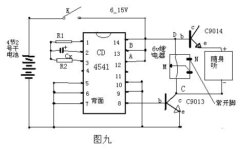 R2=2R1,计算公式T(s)=2.3nR1(欧)Cx(法),为方便计算化简如下:定R1为150k,Cx为变量。图九中A、B取负,n=4096,T(min)=23.55×Cx;A、B取正时,n=32768,T(hour)=3.14×Cx;A取正、B取负,n=128,T(min)=0.74×Cx;A取负、B取正,n=512,T(min)=2.94×Cx 。原理:CD4541是计数定时器,设定Cx后,电源接通开始计数,到设定时间后,从8脚输出脉冲信号,使C9013导通,继电器与随身听开始工作,继电器导通使功放通电,喇叭工作。注意:此处定时电路与随声听采用同一电源供电,因此用一个C9014接入,起降压作用,即中间脚与D相通,发射极连随声听正极,K为控制开关。第8脚不宜用C9014,其过流不如C9013大,随身听工作时电流在0.2-0.6A之间。悬挂条幅时,自己将D、C连接,电源用8节7号电池串联,在C9013体部拴上尼龙绳,到时C9013烧断尼龙绳,条幅脱落。C9013还可以点燃引线,使爆竹炸开箱子散发传单,吸引注意。
