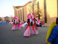 漂亮的花车,中西方学员展示着优雅祥和的功法,美妙的音乐,艳丽多姿的扇子舞,呈现给观众一幅美好的画面。街道两边站满了人,伴随着队列的行进,人们发出掌声和赞叹,有观众向我们合十,有的鞠躬致敬,还有人用中文向我们大声说“谢谢”。真象材料纷纷散发到路人手中,甚至餐馆,商店中的人都专门出来拿资料,短短的时间里一个人就能发出上百份材料。很多小孩子们拿着装圣诞礼物的袋子等候在路边,当学员把大法的真象材料放入其中的时候,他们都很开心,这可是一份最好的圣诞礼物。