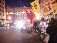晚间,一位白人妇女在等朋友一起吃晚饭,趁朋友没到之前,她主动和法轮功学员一道打起一个“法轮大法好”的横幅,欢迎温家宝的车队。