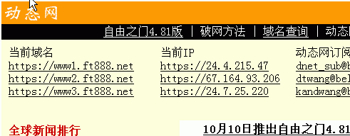 另外的办法就是利用服务端和客户端的软件,自己定义加密手段,把服务端软件安装在海外的机器后,就可以用客户端软件加密浏览海外的信息了。这种方式有很多种,比较有名的是无界浏览、花园、SSSO、Flat等代理软件。随着各种加密代理的成熟,它们互相之间也开始吸取各自的长处,有些甚至在易用性上进展很大,做到了用户点击运行就可以自由浏览的程度。因为SSSO和Flat等软件对使用者的计算机知识要求多一些,本文在此仅介绍适合新手初学使用的软件,其他的深入问题可以到动态网的论坛上去交流,那里可是相关的高手云集的地方。以下网站的域名被大陆劫持,大陆需要查找到真实IP后,用https:// 动态网 https://www.dongtaiwang.com/ 这个对初学者到高手都适用的,他为初学者提供和5至6种可以快速拿到加密代理的方法,而对于高手,可以使用它的密道技术,快速下载自己需要的大文件,比如影视的下载等。主要有如下的方式可以上动态网: 0 订阅动态网 --- 给以下任意一个邮箱发一个电子邮件,就能每一两周收到动态网技术更新,掌握最新突破网络封锁的办法。 dnet_sub@bellsouth.net dtwang@bellsouth.net kandwang@bellsouth.net 1 自由之门软件 --- 这个是最简单的,适用于多数网络环境。下载后,双击执行运行文件即可。 3 使用海外电子邮件 --- 给d_ip@bellsouth.net发一个电子邮件,10分钟内会收到回信,拿到几个IP。 4 当前最新域名 --- 无界浏览 https://www.ultrareach.net 主要有2个可用的客户端软件,下载后运行文件即可。不同的版本用了不同的加密方法,当时让国内的封网部门很是头疼,最后无奈让公安部下了个文件,说是不容许大陆的人们使用这个软件,使用就犯法。听起来是挺可笑的,这种软件越是这样封锁,网民私下传递的越快,也算是广告吧。 无界浏览3.2e 速度快。适用于多数网络环境。 无界漫游2.3 体积小。适用于任何网络环境和微软视窗平台,并且支持局域网。建议在无法使用无界浏览的网络环境下使用它。 花园软件 https://gardennetworks.com 是一个使用自己方法加密的代理软件,仅有200多K的绿色软件。用户熟悉一点代理设置的话,这个可是快速下载的利器。 代理看世界 https://uw.d2g.com 另一款SSL加密页面代理,人多的时候经常出现页面无法显示(和被过滤的现象一样),一般重新刷新或者换一个节点会好些,需要点耐心。 在线加密代理列表 一些网站提供在线加密代理列表,比如宇明小站(https://ym01.pledaily.com)等。这个对新手比较简单。而且宇明的最新域名都是可以从大陆直接看到的,也可以从Google上搜索“宇明小站”,就会找到最新他的域名。 其他的突破封锁的软件还有一些,限于篇幅,这里就不介绍了,动态网的论坛上有更多的相关交流,感兴趣的人们可以去那里看看。 其实从客观环境上讲,能够根本封锁中国大陆的网络技术根本就不存在。除了这里谈到的软件以外,人们日常应用的Email、电话、电视等工具也在方方面面传播着各种信息,从方方面面打破着信息封锁。现代科技的发展,把不同国家、社会的发展都逐渐地融合到了一起,互相依存的因素越来越多。愚蠢执政者的一意孤行的封锁,在表面的暂时掩盖,只会更加激化各种矛盾,从而在矛盾积累到爆发点的时候,会直接危及政权到解体的程度。也许历史就是这样,回过头来看看的时候,谁都说谁谁当时怎么那么愚蠢呢?怎么就扮演了那么个历史角色呢?一点感想,见笑了。 这里主要讲了一些中共在国家网关级别的封锁,其实它为了封锁各种信息的自由传递,在各个地方的ISP也开发应用了各种封锁、监视手段,有些网吧的管理软件已经可以做到实时检查用户的计算机屏幕的程度,个人隐私在中共的字典里恐怕和笑话是同意词了。本文先写到这里吧,欢迎各位朋友多多指教。