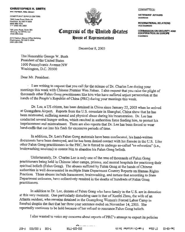 我写信请求你在本周会晤中国总理温家宝时呼吁释放查尔斯-李医生。我也请求你在本周会谈中提及其他成千上万像他这样在中华人民共和国遭受不公迫害的法轮功学员的处境。