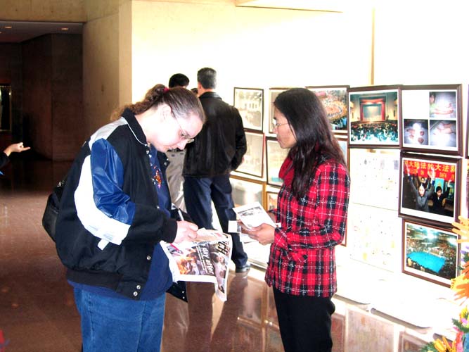 从图片中,人们看到了大法洪传世界的殊胜景象,看到了大法带来的祥和、宁静,同时镇压者的残暴也暴露无遗,引起人们的气愤。几乎所有经过这里的人们都接受了学员们递上的材料并在营救李祥春的明信片上签名。有的当场仔细地阅读传单,了解真相,更有一位女士还告诉我们她早就知道了有关李祥春医生的故事,这次她不仅自己签了名,还向学员索取了更多了的明信片,说想让她的朋友们帮助营救李祥春医生。