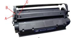 HP1150打印机使用的硒鼓型号是Q2624A(以下简称24A),价格是580元左右;HP1000、HP1200打印机使用的硒鼓型号是C7115A(以下简称15A),原装鼓价格是430元左右,二次灌粉的代用鼓价格不到300元。24A和15A价格相差很大,而结构几乎是一样的,我们可以把15A加工成24A使用。两种硒鼓结构上的差别仅在于感光鼓左侧上方的边角处(下图A处)、盖板支脚左侧(下图B处)和废粉仓上部左后侧(下图C处)这三个地方略有不同。与15A相比,24A在C处多了一个突起,而这个突起对于HP1150打印机本身来说没有用处,只是有了这个突起就不能把24A放在HP1000、HP1200中使用了,所以这个地方的差异我们可以不管它;24A在A、B两处缺了一角,我们可以用电烙铁和锋利的裁纸刀将15A在这两处削掉同样的一角,经过这样加工后15A就可以代替24A使用了,我们点上用了几个月,没有发现问题。加工后的15A仍然还可以在HP1000、HP1200打印机上使用。