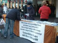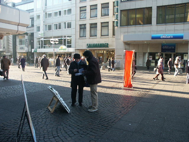 前一天,一个广播电台的记者采访了一位汉诺威法轮功修炼者,从而使公众了解到熊伟在中国被关押的情况。12月10日广播中播出了这段采访,也提到了我们今天的活动,所以我们的展位前来了很多人。许多听众特意赶来,为我们签名,并祝我们成功。