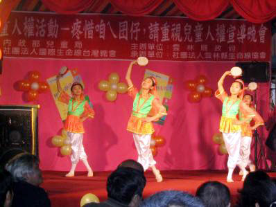 【明慧网2003年12月24日】云林县内第一场儿童人权宣导活动12月20日晚间在斗六太平老街举行,中部地区法轮功学员应主办单位之邀,安排了舞蹈、动画欣赏与功法表演等节目参加了活动,望人们关注法轮功学员儿童人身安全、受教育权与信仰自由遭剥夺之严重问题。