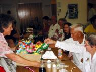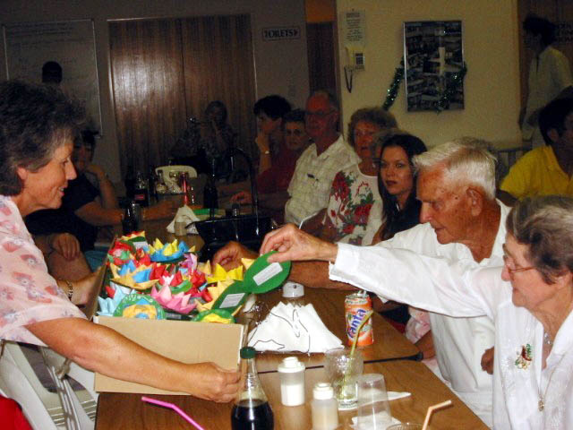 阳光海岸的学员们还折叠了精美的莲花,分别赠送给在场的每一位老人。主持人还利用联谊会的机会向所有与会者介绍了“和平的花瓣”活动,告诉人们一个来自中国的澳籍小姑娘法度的父亲因坚持修炼法轮功在中国被迫害致死的情况,小法度跟着妈妈奔走于世界各地,呼吁善良的人们协助制止这场发生在中国的迫害,并希望全世界所有的孩子都能生活在公正,和平,幸福的环境中。老人们聚精会神地听着,思索着,翻阅着手中的真象资料。