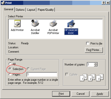 【明慧网2003年12月28日】通过电子邮件收到的明慧每日文章,是将全天的文章放在一个HTML文件中。有时我们需要打印其中的一篇文章,用普通的打印方法就很难实现。Internet Explorer (IE) 提供了一个很方便的方法:打开每日文章HTML文件,用鼠标器选中要打印的部份(如一篇或连续的几篇文章) ,然后选择菜单中的打印,在打印窗口中选择 “选定区域”(Selection) 。这样就只打印所选择的一部分了。