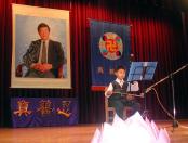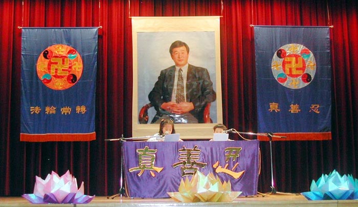 在心得交流前,先由六十多位小弟子上台背诵法轮大法经文,其中有些年龄很小的小弟子也都可以背得一字不差。现场报以热烈的掌声。