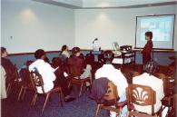 十一月八日上午,我们介绍了大法洪传世界、天安门自焚栽赃案真象、在中国发生的对法轮功的迫害,世界各国政府和人民对迫害的谴责和对法轮功学员的支持。演示部分结束后,我们认真回答了听众提出的问题,有一个听众,是一个学生,在我们的演示现场义务服务,他对我们说:“自焚一看就是假的。”大家都为他了解了真象而高兴。