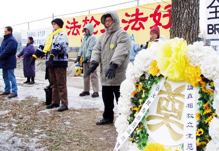2003年12月29日中午,来自蒙特利尔、渥太华的法轮功学员在中国驻加拿大使馆前悼念因插播法轮功真象而被折磨致死的长春法轮功学员刘成军,并要求严惩长春恶警,惩办迫害元凶江泽民。