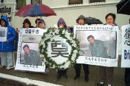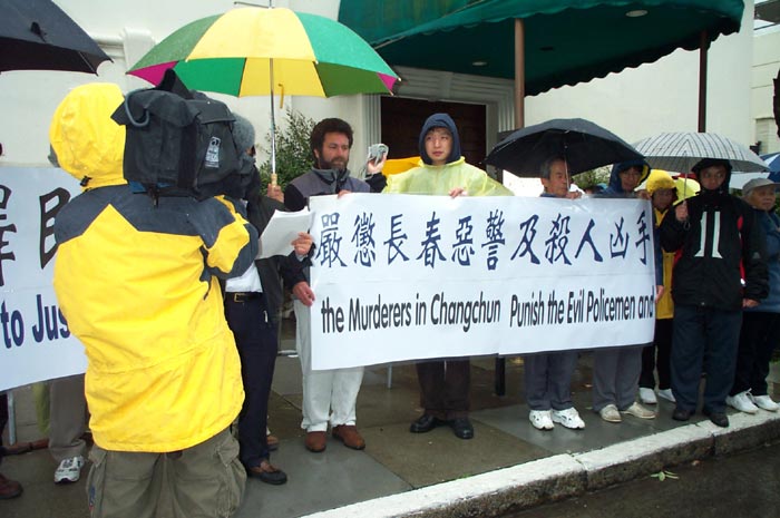 【明慧网2003年12月30日】12月29日,北加州法轮功学员冒着狂风暴雨在中国驻旧金山领事馆前举行追悼会及烛光守夜,强烈要求惩办迫害法轮功的元凶江泽民、严惩长春恶警及杀人凶手。长春法轮功学员刘成军因在长春有线电视插播法轮功真象被非法逮捕,并被酷刑折磨致死。