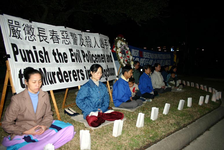 休士顿法轮功学员在中领馆(官邸)前的草坪上举行烛光守夜,为刘成军送行,同时,强烈要求严惩罪恶之首江泽民,以及长春恶警和杀人凶手。同时也希望全世界正义之士,谴责江氏集团的对善良民众的暴行,终止这场对坚持真善忍信仰的法轮功学员的迫害、摧残和虐杀,支持和平理性的法轮功学员坚持真理、揭露谎言的正义行为。