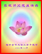 慈悲伟大的师父:直此新春佳节将临之际,我们上海大法弟子谨向您拜年!我们将遵循您的教诲继续做好三件事,尽心尽力讲清真象。争取帮助更多世人正确选择自己的未来。也给一切还没有选择断绝自己后路的世人以机会。我们会告诉他们:“善恶有报是天理,只争来早与来迟。”江××一意孤行,非法残酷的迫害法轮功,已经欠下了法轮功学员至少827条人命,它绝对地无法逃脱历史和法律的惩罚。我们也会告诉人们:一切善待法轮功和法轮功学员的人们,在不久的将来,一定会看到自己现在的善行所带来的美好!