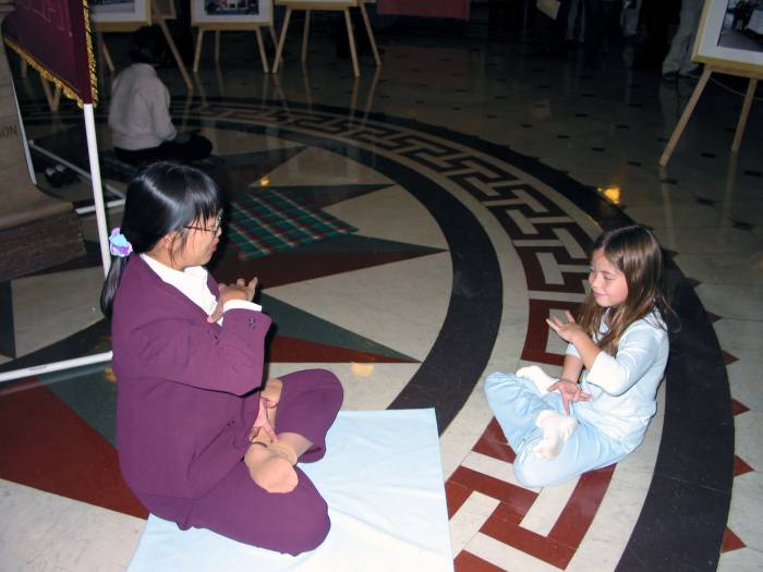 | 学员教功 | 刚学功的小姑娘在打坐 |