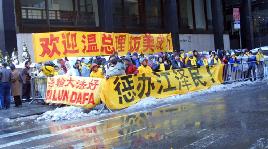 纽约周末的大雪刚过,在凛冽的寒风中,法轮功学员们打出“欢迎温家宝访美”、“惩办江泽民”、“法轮大法好”等横幅。向来访的温家宝一行及来往的行人展示着法轮大法在美国这块自由的土地上祥和的风貌。
