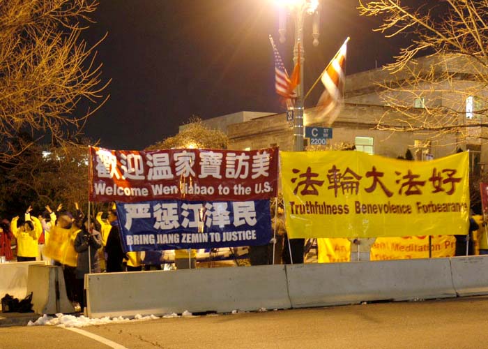 约7时许,温家宝抵达国务院,约10时离开。结束国务院访问后,温将访问国会及白宫,法轮功学员将在温访美期间继续呼吁。