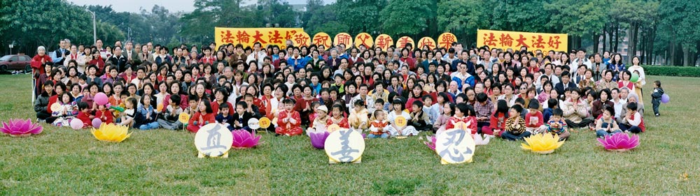 2003年1月12日台湾宜兰弟子在风光明媚的冬山河畔举行半日学法、发正念活动。尽管寒风凛冽,但大伙儿心底暖洋洋地,因为学大法是最有福分的人,「佛光普照,礼义圆明」。