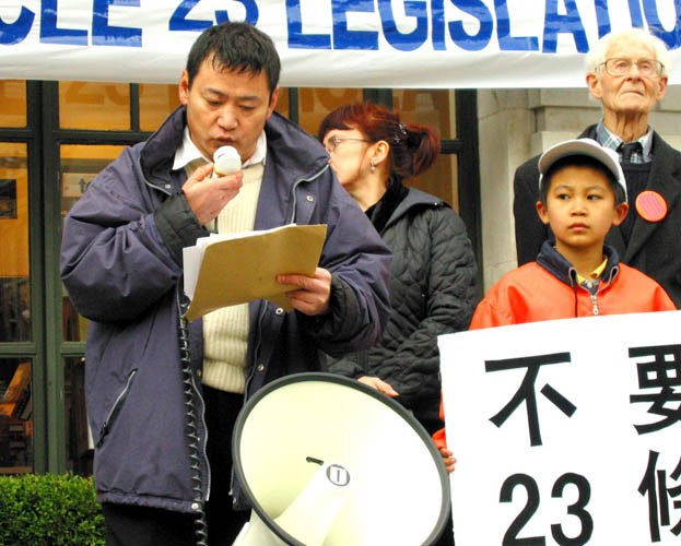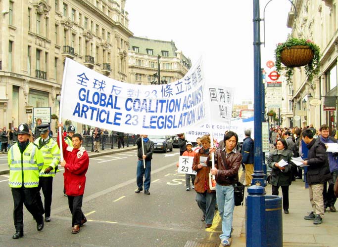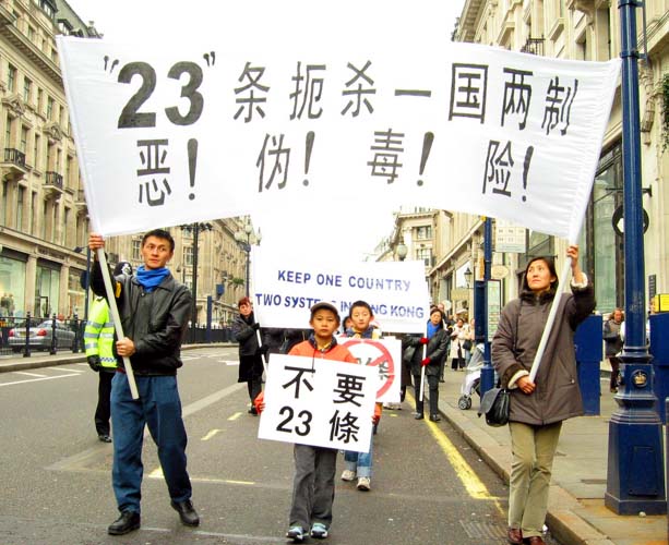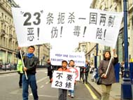 而中国人的反应也大出人意料。为使路人更清楚游行目的,队伍中一位先生用中英文喊着:“23条剥夺自由,停止实施23条,抗议迫害无辜,呼唤平等人权,呼唤平等自由”的口号,很多路人拍他的肩膀以示敬意和谢意,其中不乏中国人。很多开车的中国人,在经过游行队伍时纷纷竖起大拇指,还有不少中国游客对印着“江泽民刽子手被告上法庭”的横幅情有独钟,吃惊之余纷纷拿起相机拍照。更有一对来英国旅游的中国夫妇对一位游行者说,他们看了一些英国当地的中文报纸后,他们发现国内大量信息都被过滤了,很多真实情况都被掩盖。
