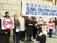 【明慧网2003年2月10日】2003年2月8日,全球反23条立法联盟欧洲同盟在伦敦集会,抗议北京胁迫港府订立23条反颠覆法。