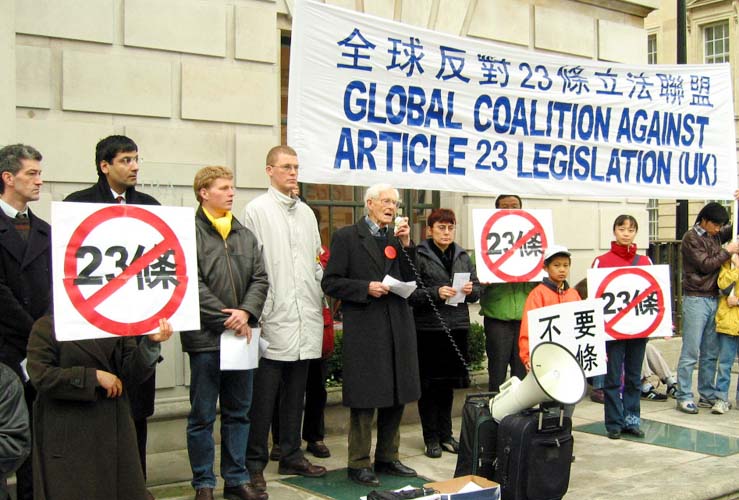 2月8日上午12点,全球反23条联盟欧洲同盟在中国驻英国大使馆外举行新闻发布会。发布会以瑟罗勋爵的发言开始。在发言中,瑟罗勋爵全面深入抨击了江氏集团对香港自由的迫害。瑟罗勋爵是前英国资深外交官,曾任上议会议员。其后多个团体成员先后发言。