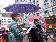 参加表演的大法弟子来自生活的各个领域。有专业演员,但更多的是业余演员。大法弟子们的文艺节目和功法表演吸引了很多路人驻足观看。其他未参加表演的弟子则分发真相传单和征集营救国内亲人活动的签名。活动一直进行到夜幕降临。