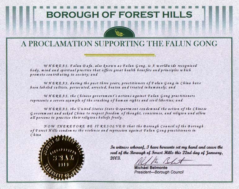 因此福雷斯特希尔斯区区议会谴责在中国对法轮功修炼者们的暴力镇压;
