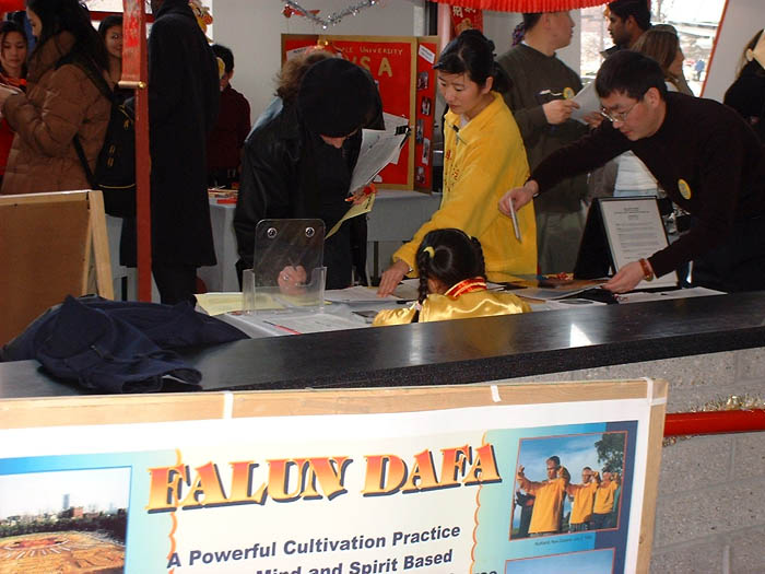 【明慧网2003年2月16日】2003年2月11日中午,位于费城的天普大学(Temple University) 的学生们兴致盎然地在学生中心举办了一次庆祝中国农历新年的活动。这个活动充满了浓厚的民族色彩,有越南民族舞蹈、朝鲜击锤表演和中国彩带舞表演等。费城地区大法弟子也欣然应邀参加了这次庆祝新年活动,向该校的师生们展示“真善忍”的美好,告诉他们法轮大法在中国遭到的残酷迫害的真相,以及为紧急营救Charles Li(李祥春)征集签名。