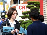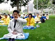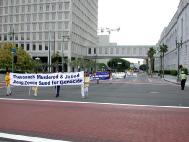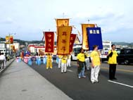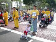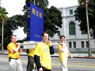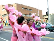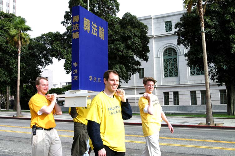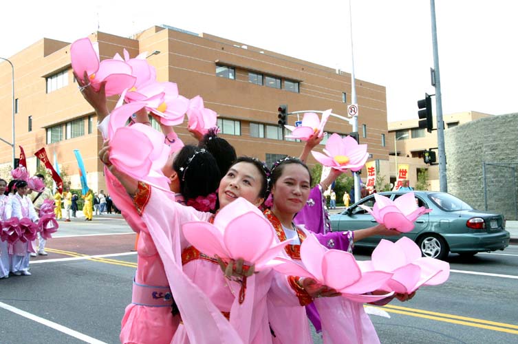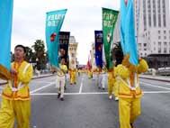 法轮功学员在游行中表演舞蹈