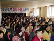 【明慧网2003年2月18日】2003年2月15日,韩国法轮大法心得交流会在大田市召开。参加这次交流会的学员,比起往年新学员较多。当天晚上,学员们分组进行了学法、发正念和交流,很多学员感到这是难得交流的好机会并与各地学员通宵进行了交流。16日清晨,学员们聚集在运动场上一起炼功、三次整点发正念后,又用了整个上午时间新老学员围绕学法、和发正念进行了分组交流。一位九十三岁的老大爷说他历尽了千辛万苦终于找到了大法,他现在的身体不比年轻人差,而且每天过得都很充实、幸福。下午,部分学员与大家交流了他们的心得体会。他们感人的故事使学员们热泪盈眶,赢得了阵阵的掌声。通过这次交流会,新老学员都得到了很大的提高,更加认识到了师父告诉我们目前要做好的三件事(即学法、讲真相和发正念)和形成整体的重要性。