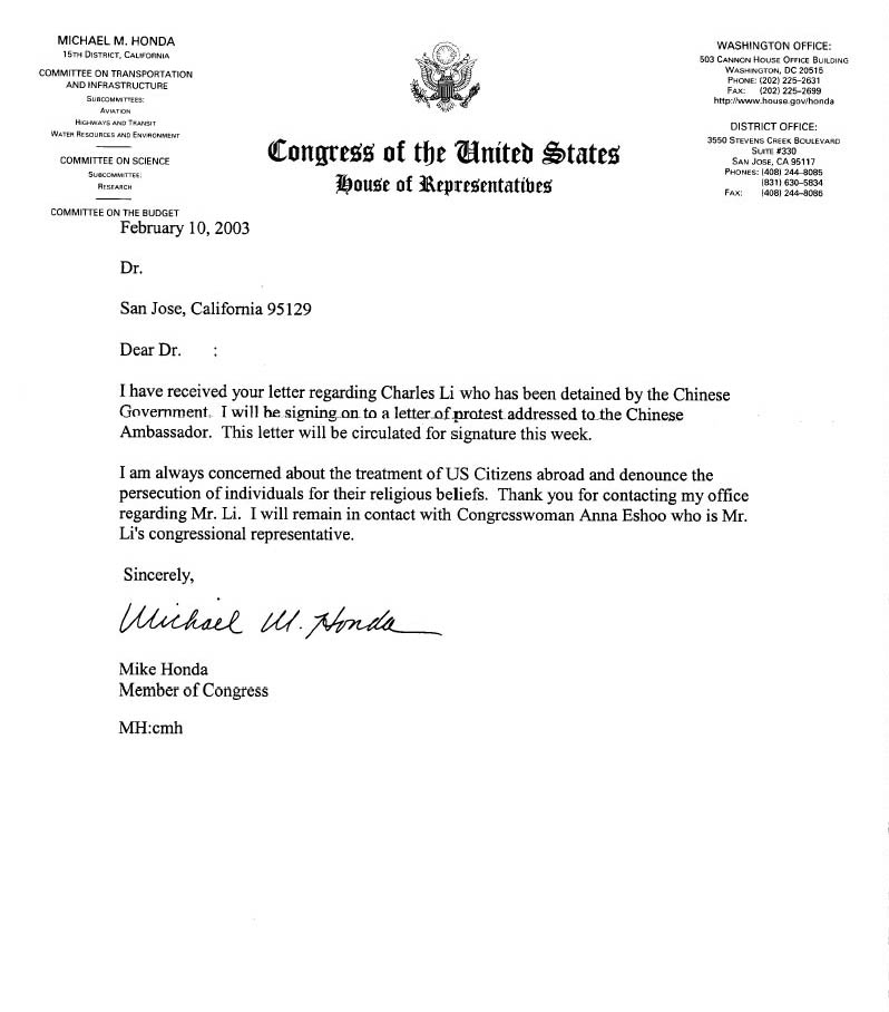 我收到了你关于李祥春被中国政府拘留的信。我将在一封给中国驻美大使的抗议信上签字,这封信正于本周在众议院内征集议员签名。