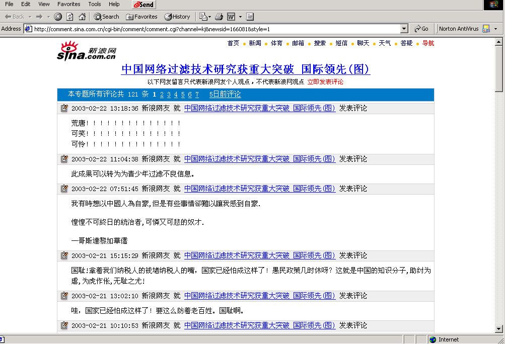 许多网友不相信政府的信息,并也学会了自己想法对付政府的封锁,有一个网友说,“(这一技术)不过仅仅基于文本,怎么著都没法防住的,上次收了封信,就是一个gif图片,里面一个flg小报,直接扫描的。对这样的信,恐怕内容过滤也是没有办法的。互联网不需要过滤,我们需要一切信息,过滤留给个人的大脑干吧。中国政府少操心。”另有网友推荐用代理服务器,他说:“我用免费代理服务器,天天看敏感的网站。一点事也没有。”还有人指出,“中国政府99年镇压法轮功,而这一研究在9年前就开始了,是不是政府早就有预谋?”对于政府想要过滤的言论,有网友说,正因为如此,他才开始认真的思考这些言论。
