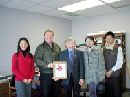 法轮功学员邱楠楠代表被加拿大政府营救出劳教所的父亲、弟弟和其他法轮功学员向市长先生表示了最真诚的谢意,并赠送了由学员设计和制作的感谢奖状,奖状上是学员的剪纸作品“善”字。当他接过奖状时,我们看到了他的眼睛里闪烁着感动的泪花。