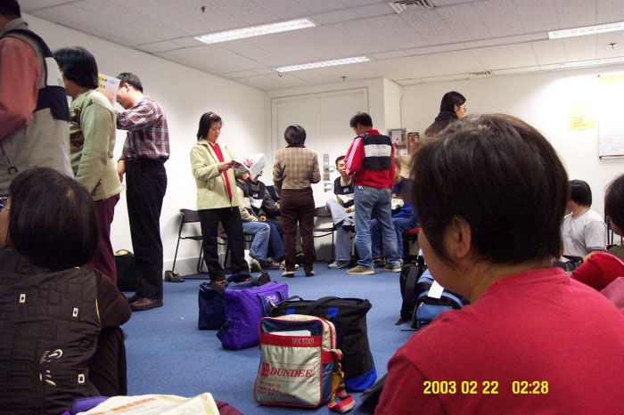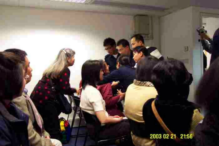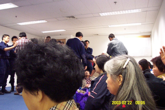 由于密闭拘留室内的空气愈来愈恶劣了,我们一再反应可否开一扇门通风,回应是不行,有个入境处航警名叫陆嘉荣,甚至粗暴的将两位女学员一把摔倒在地还洋洋得意,完全不尊重女性,经我们极力向他们长官反应,才得到改善,在二十二日早上十点,大批航警和雇用的打手来到这拘留室,强迫安排我们搭机离境,如不顺从就动用四、五个打手把学员强行抬走。这前后长达近十五个小时的非法拘留让我们完全看到香港在沉沦,在恶法二十三条尚未立法前就能以不可告人的手法戕害人权,倘若一旦立法完成,政府更能高举“维护法律”的大旗明目张胆大肆践踏人权。