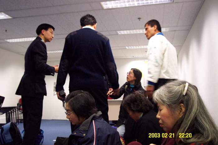 没有给我们任何合理理由非法将我们长时间监禁在此,也见不到负责人出面说明,把我们当作人犯对待,没有提供食物和休息的地方,年纪大的学员向他们要求上厕所,这种人的基本需求也必须层层上报才批准,必须由两个入境处雇用的工读生在厕所内监视的情况下如厕,完全没有基本人权,我向他们的长官反应,得到的回应是凶恶的说「要上就上,不上就出去」,其中大都是这些看似单纯的年轻人出手干坏事,这些十几岁的孩子被利用做为迫害我们的工具,有的干坏事时的面目表情真是穷凶恶极,与他们实际年龄所应保有的纯真完全不符,好象没有人性一般,学员们理解到他们是被蒙蔽的一群人,因此对他们讲清真相,少数的能善意的理解。