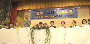 代表民间人权阵线发言的蔡耀昌先生除了对法轮功学员表达万分敬意,还明确地指出公民抗命要等23条通过后才进行,当务之急是制止23条于七月通过,为自己和下一代负责。
