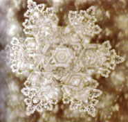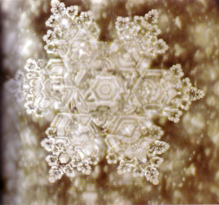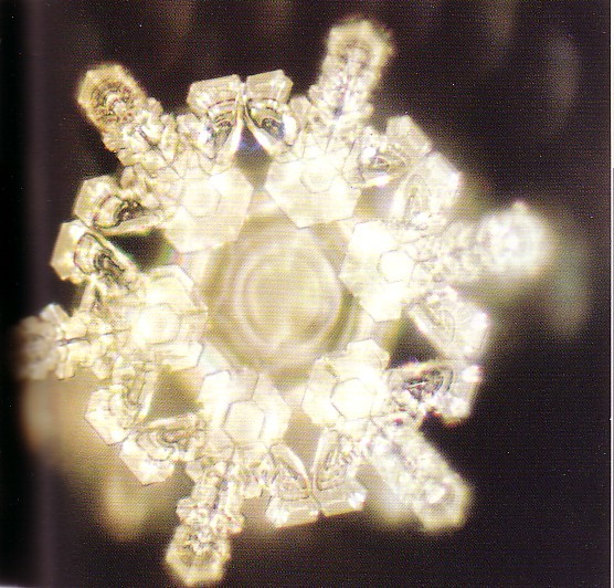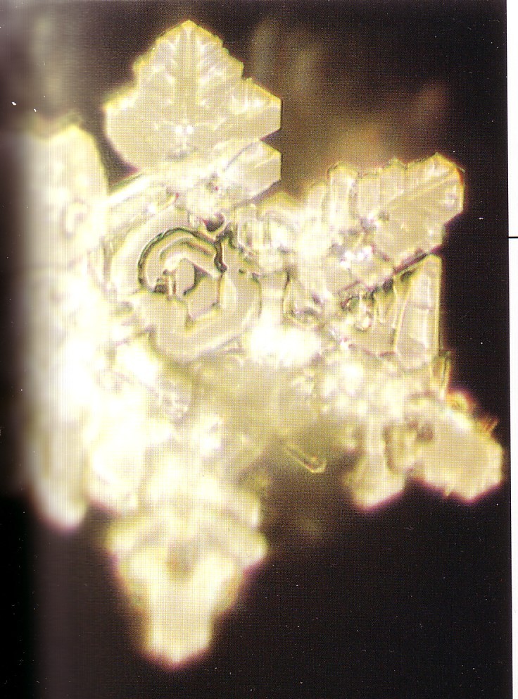 图1.“三分泉”的水结晶这幅结晶图出自“三分泉”的水(图1) 。“三分泉”在日本山梨县北巨摩郡。泉水在某一处分为三路,故名“三分泉”。这个结晶的每个角也有三个分支。