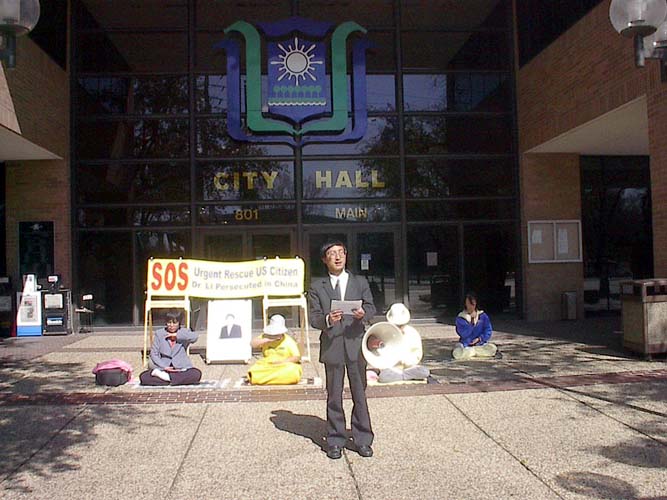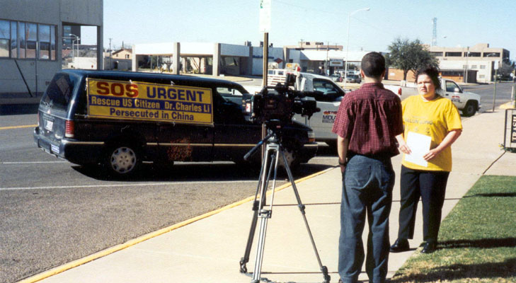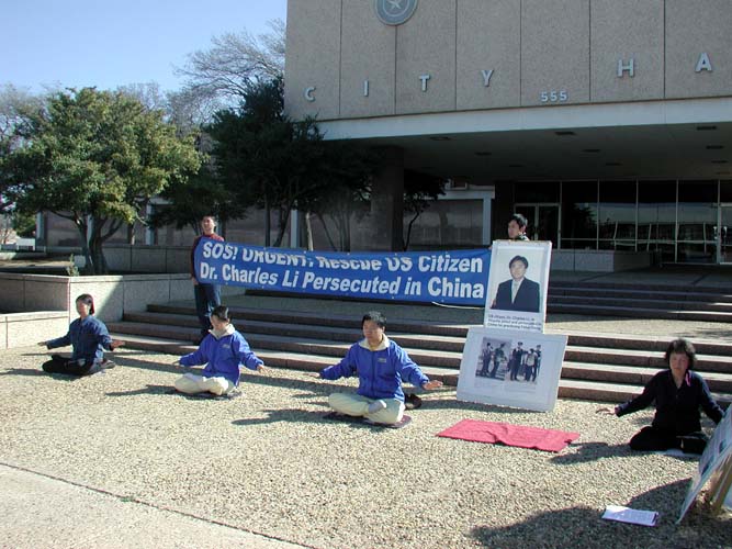 (5) 最后一队是在德州中部。从休士顿(Houston)出发,主要途经Dallas,Waco,Temple,Austin,Bryan等城市。我们在各个城市的市政大楼前举行新闻发布会,世界日报以及西方媒体的电视台、报纸等都对我们进行了采访。民众们纷纷签名表示支持。媒体的采访非常认真,除了详细拍摄我们炼功的场面和关于李祥春的被捕情况外,还详细地询问了关于中国迫害法轮功的问题,还询问了我们同行的一位学员在曾经回国遭受迫害的情况。当他们看到眼前这么一个活生生的被迫害的例子时,更加地震惊。