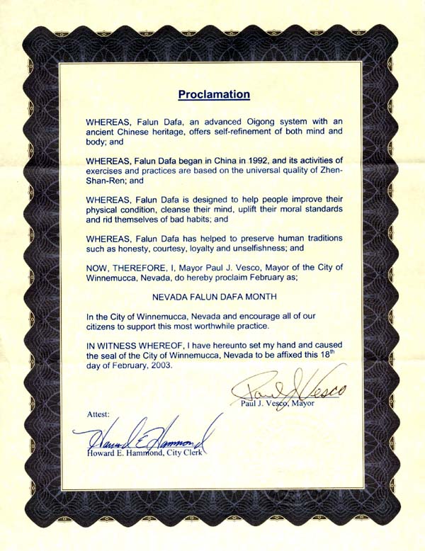 【明慧网2003年2月27日】美国内华达州温纳穆加(Winnemucca)市市长宣布2003年2月为内华达州法轮大法月。