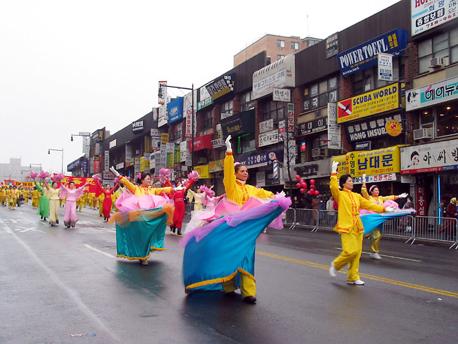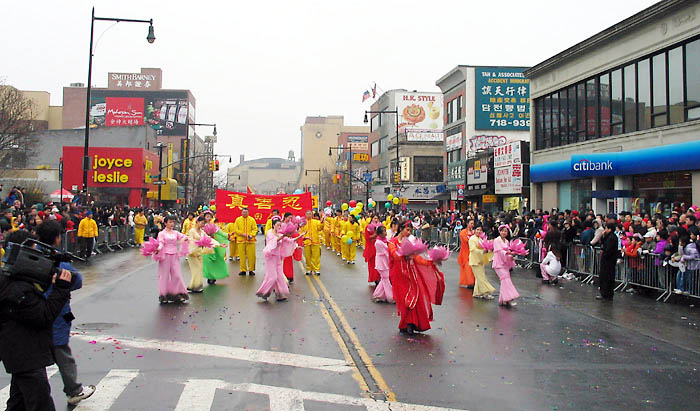 【明慧网2003年2月3日】2003年2月1日,大纽约地区法轮功学员参加了法拉盛华人新年游行活动,学员的表演受到两旁观众的热烈欢迎。