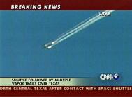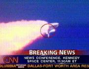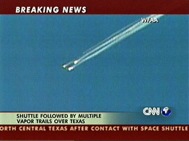 美国各大电视网星期六(1日)播放了哥伦比亚航天飞机1月16号升空时的若干画面,从画面上可以看到航天飞机外袋料箱的一块隔热片脱落,打中飞机左翼。