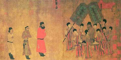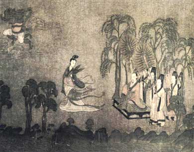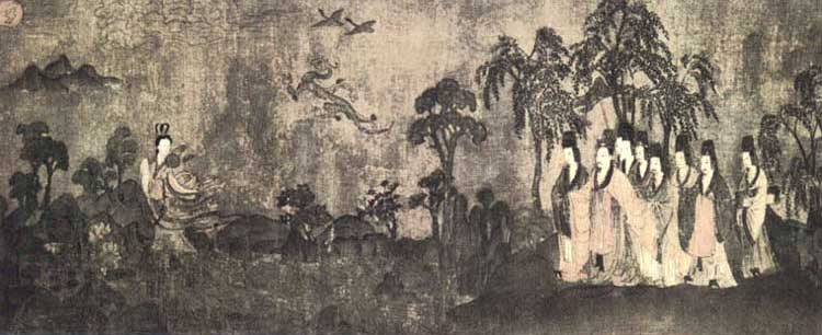 宛若一段清雅序曲的隋朝艺术刚刚结束,华夏文化历史的黄金时代──唐朝终于来了。这个神奇而富有创新的朝代把华夏丹青艺术推上了顶峰。唐朝初期的《步辇图》通过古朴而精湛的绘画技法刻划了唐太宗李世民接见吐藩使者时的情景。此画不仅展示了当时盛唐发达开明的文化,对人物性格及精神状态的描绘更是维妙维肖。唐太宗祥和而又威严的天子风度在画家的笔墨下渲染得更加生动传神。生活在这个宽松的政治时期的艺术家们不仅有着豁达的胸怀,其气魄与胆量也是前无古人后无来者。吴道子,这个唐代画坛怪杰,作品以“守其神,专其一”的艺术法则为宗旨,被奉为“画圣”。他所画的仙人“天衣飞扬,满壁生风”。据说他的代表作之一的地狱变壁画,下笔劲怒,地狱恐怖场面表现得淋漓尽致,使那些都城内的屠夫们看后吓得纷纷改业。当时画坛的另一位才子,王维,字摩诘,他善诗赋,通音律,还是一名虔诚的佛教徒。他一生追寻解脱的境界,早年生活的坎坷使他看淡人生的得失,后半生隐居山林,参禅问道,诗书画仿佛也只是他的消遣罢了。他的《辋川图》给人一种远离尘世,超然物外的新鲜感受,表现了他那安宁而高远的艺术心境。
